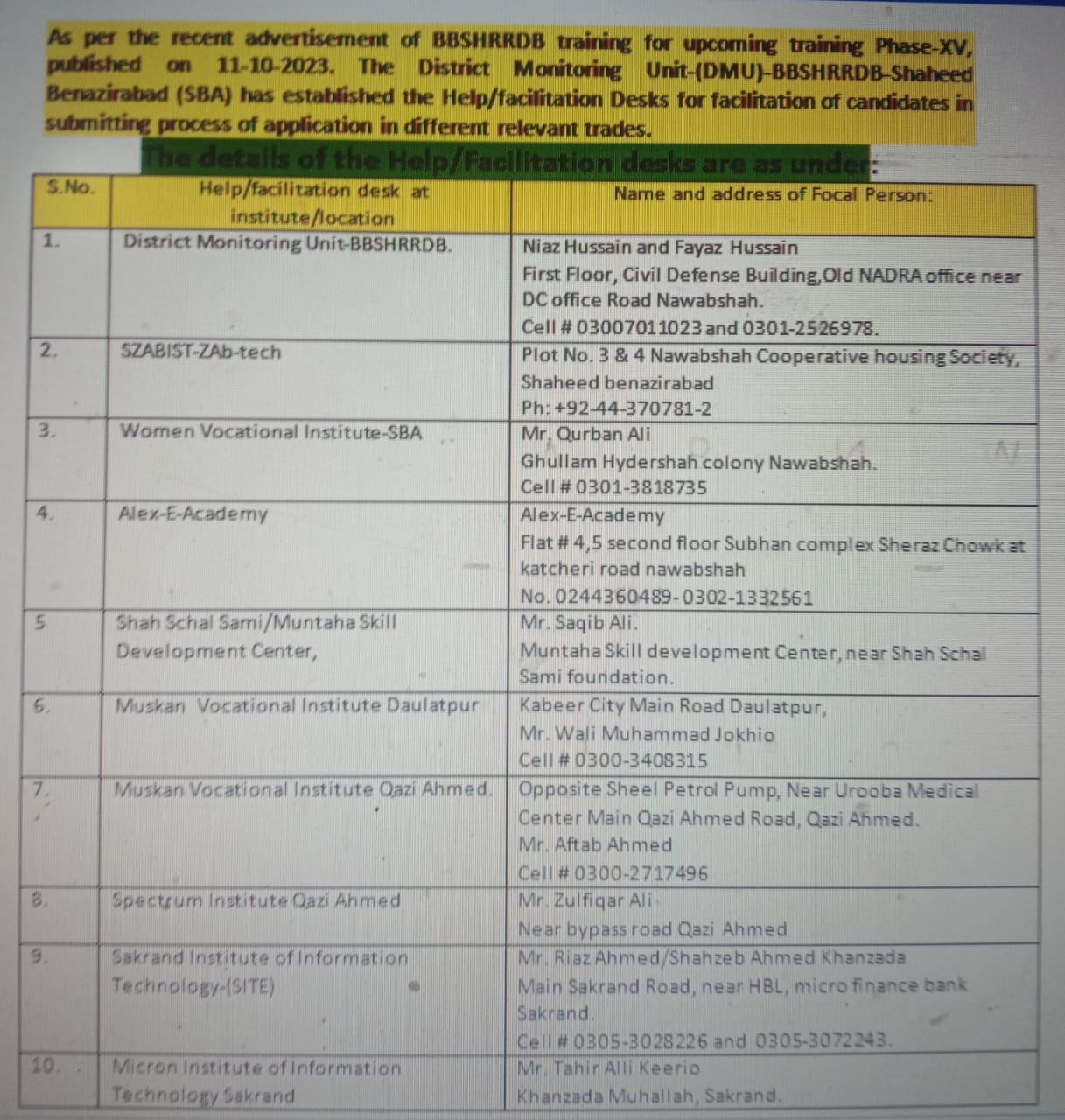 Benazir Bhutto Shaheed Human Resource Research and Development Board has been providing vocational training courses with monthly stipend since 2008. Now BBSHRRDB is offering 2 to 24 months’ comprehensive vocational training courses for the unemployed youth of Sindh aged between 18 to 35 years holding valid CNIC. Monthly Stipend and dislocation allowance (if applicable) will also be paid to the trainees. Online applications are invited for training courses in following employable trades from unemployed youth holding Sindh Province Domicile. Last date of submission of online application forms is 15 days from the date of Publication of this advertisement.